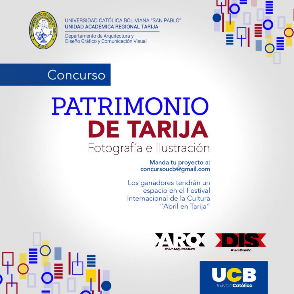 Concurso de Fotografía e Ilustración: Patrimonio de Tarija Eventos, Concursos Fecha & Hora: marzo 19, 2018 8:00 am to 7:00 pm Detalles de Contacto adasandoval@ucbtja.edu.bo Bases del Concurso Relacionado