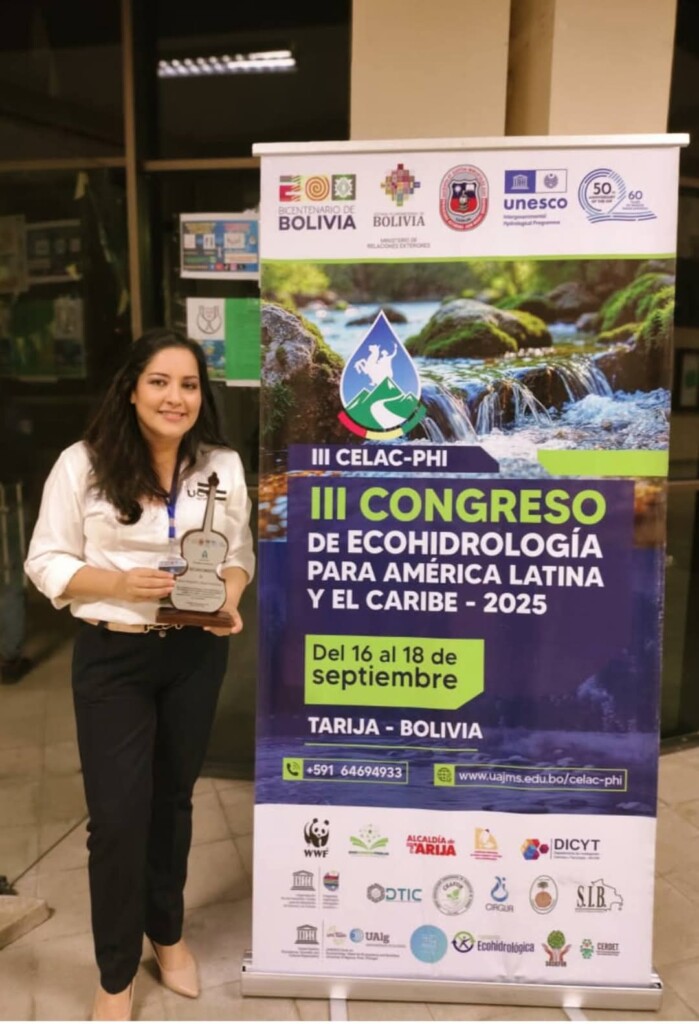 El pasado mes se llevó a cabo el III Congreso de Eco-hidrología para América Latina y el Caribe (CELAC PHI) Del 16 al 18 de septiembre de 2025 en la ciudad de Tarija, con la destacada participación UCB Sede Tarija, donde las docente investigadoras PhD. Ing. Ma. Alejandra Leigue Fernández, integrante del Centro de Investigación CIICE y docente de la carrera de Ingeniería Civil, participó del evento como ponente invitada en este prestigioso Congreso. En su exposición la académica presentó proyectos de investigación experimentales en la gestión del agua, en especial en saneamiento cuyos artículos han sido publicados oportunamente. Su contribución promovió el intercambio de conocimientos, y el resultado comprobado de distintas alternativas de tratamiento para manejo adecuado de lodos residuales aplicando soluciones basadas en la naturaleza. Con estas intervenciones la UCB reafirma el compromiso con la investigación coadyuvando en la restauración de servicios ecosistémicos, la resiliencia al cambio climático y la gestión sostenible del agua.